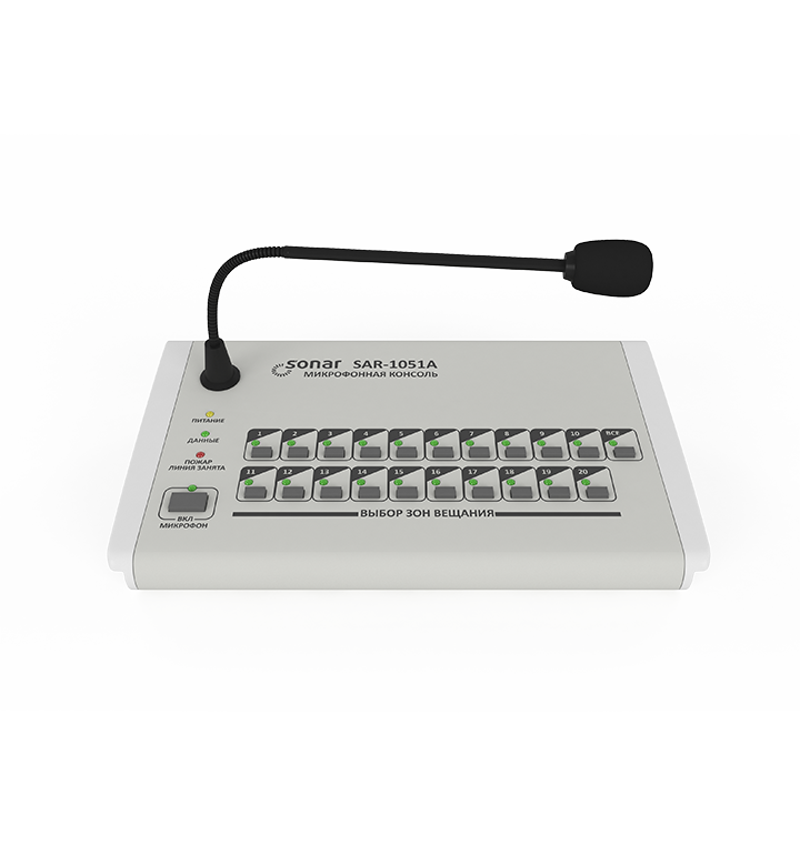 Sonar SAR-1051A - Пульт микрофонный с селектором на 20 зон оповещения. Подключается к SRG-3220. Индивидуальный выбор зон или включение всеx, звуковой сигнал, подавление обратной связи, встроенный микрофон на гибком держателе. Для работы несколькиx пультов используется блок SDR-1104. Удаленность до 1000 м.